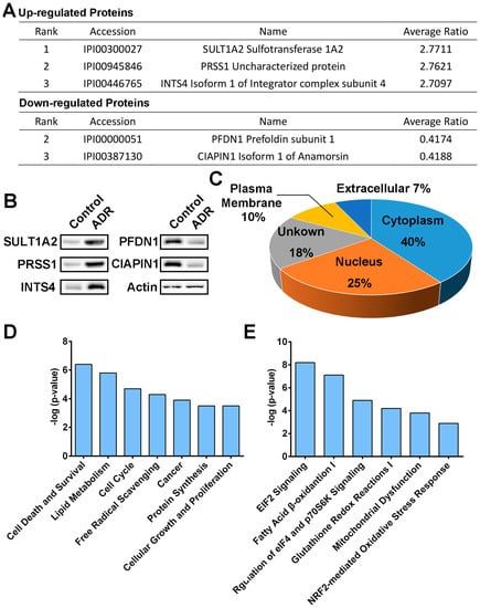 (A) Five of the most ADR-regulated proteins; (B) western blotting validation of the five proteins; (C) cellular distribution of ADR-modulated proteins in MV4-11 cells; (D) ADR-regulated cellular functions in MV4-11 cells from IPA analysis; (E) ADR-regulated pathways in MV4-11 cells from IPA analysis.