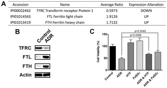 (A) ADR modulated proteins involved in intracellular iron regulation; (B) western blotting validation of the proteins; (C) the effect of HTF and FeSO4 on ADR-treated MV4-11 cells viability.