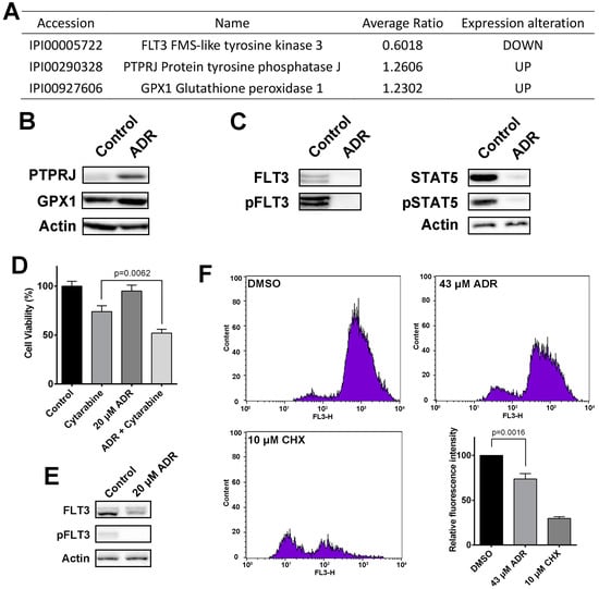 As MV4-11 cell line is characterized by homozygous FLT3-ITD mutation and activated FLT3 drives multidrug resistance of the cell line, FLT3 signaling pathway in response to ADR treatment was considered the most important factor that influences ADR’s anticancer effect. Three ADR-modulated proteins were involved in FLT3 signaling pathway, including FLT3, PTPRJ and GPX1 (Figure 6A). Proteomic data showed that ADR down-regulated FLT3, while up-regulated PTPRJ and GPX1. Results from western blotting validated this conclusion (Figure 6B,C). PTPRJ was reported to negatively regulate FLT3 phosphorylation and downstream signaling activity, and depletion of PTPRJ was associated with site-selective hyperphosphorylation of FLT3 [43]. GPX is an antioxidant enzyme involved in catalyzing the decomposition of harmful H2O2, which reverses H2O2-induced inactivation of PTPRJ, thereby allowing PTPRJ to dephosphorylate FLT3 and inhibit its downstream signaling [44].