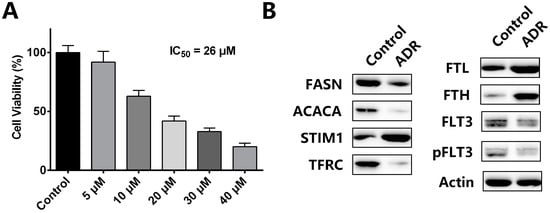Therefore, we adopted 26 μM as our experimental concentration in subsequent assays. Results from western blotting showed that ADR significantly down-regulated FASN and ACACA, while up-regulated STIM1 (Figure 7B), indicating that ADR inhibits fatty acid synthesis in NB4 cells. In addition, the effect of ADR on iron pool of NB4 cells was tested with western blotting. ADR significantly down-regulated TFRC, while up-regulated FTL and FTH (Figure 7B), suggesting that ADR decreases intracellular iron pool in NB4 cells through inhibition of iron uptake and retention of iron in storage repositories. In the case of FLT3 signaling, as NB4 cell line is a FLT3-wildtype cell line, ADR only suppressed FLT3 signal pathway to some extent in NB4 cells, which differed from the significant inhibitory effect in MV4-11 cells (Figure 7B). To conclude, ADR also suppresses fatty acid synthesis, cellular iron pool and FLT3 signaling in NB4 cells, indicating that the inhibitory actions of ADR on the pathways in the study also work in other AML cell lines.