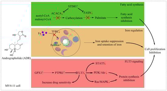 Since very few studies have been done to investigate the effect of ADR on MV4-11 cells, we started from evaluating the antiproliferation activity of ADR. Results from the cell viability assay showed that ADR inhibited MV4-11 cell proliferation in a dose- and time- dependent manner. Subsequently, a quantitative proteomics approach was applied to study the MOA of ADR on MV4-11 cells. As a result, 552 out of 3604 proteins were identified to be significantly modulated by ADR in MV4-11 cells. With proteomic analysis, we concluded that ADR inhibited MV4-11 cell proliferation through affecting three signal pathways, including inhibition of fatty acid synthesis, inhibition of iron uptake and retention of iron in storage repositories, and blockage of FLT3 signaling and its downstream protein synthesis (Figure 8).