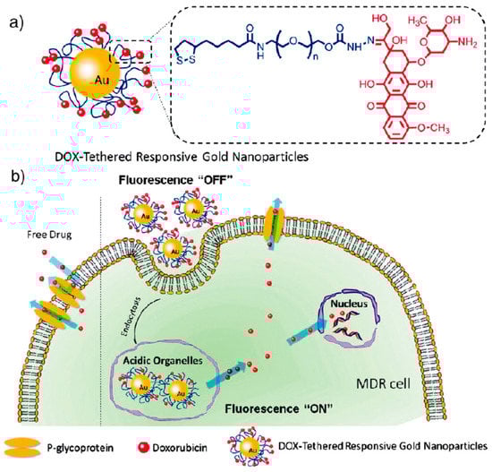 Conjugates of Au NPs with drug molecules play an important role in the therapy of endocellular diseases [,]. They could improve drug efficacy. Antibiotics or other drug molecules are able to directly conjugate with Au NPs via ionic or covalent bonding, or by physical absorption. For instance, 13 nm colloidal Au has been combined to methotrexate []. Methotrexate is an analog of folic acid which has the ability to restrain the growth and reproduction of cancer cell and has been usually used as an anticancer drug. The carboxylic groups on the methotrexate molecule can combine to the surface of Au NPs after overnight incubation. At the same volume, it has been indicated that the concentration of the methotrexate bound to Au NPs is higher than that of the absence of Au NPs. In another study, doxorubicin (DOX) was attached to 30 nm Au NPs through a pH-sensitive linker. This type of DOX-Au NP attachment allows for the intracellular triggered release of DOX from the Au NPs once inside acidic organelles. This allowed for a rapid increase in intracellular DOX concentration, thereby enhancing therapeutic effects in drug-resistant tumor cells [] (Figure 1).