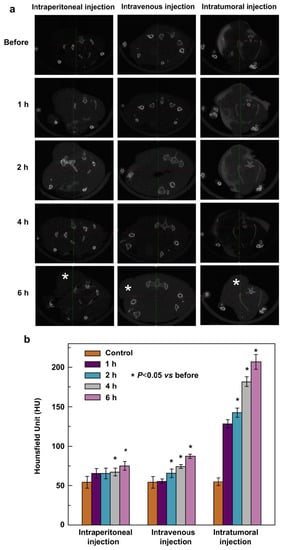 Representative axial micro- computed tomography (CT) images (a) and CT values (b) of the xenograft SPC-A1 tumor in nude mice before and after injected with {(Au0)50-G5.NHAc-FA5} DENPs by different injection routes for 1, 2, 4, and 6 h. The star “*” in (a) indicates the location of the tumor []. Reproduced with permission from reference []. Copyright (2013), with permission from Elsevier.