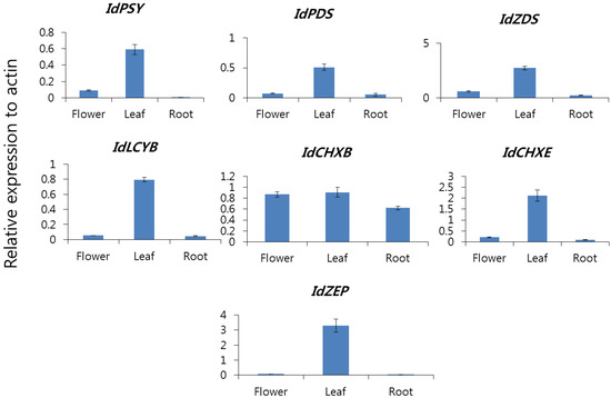 Transcript levels of IdPSYs, IdPDSs IdZDSs, IdLCYBs, IdCHXBs, IdCHXE, and IdZEPs in the flower, leaf, and root of I. dentata. The height of the bar and the error bars indicate the mean and standard error, respectively, that was derived from three independent experiments. At least three different samples were used for an individual experiment.