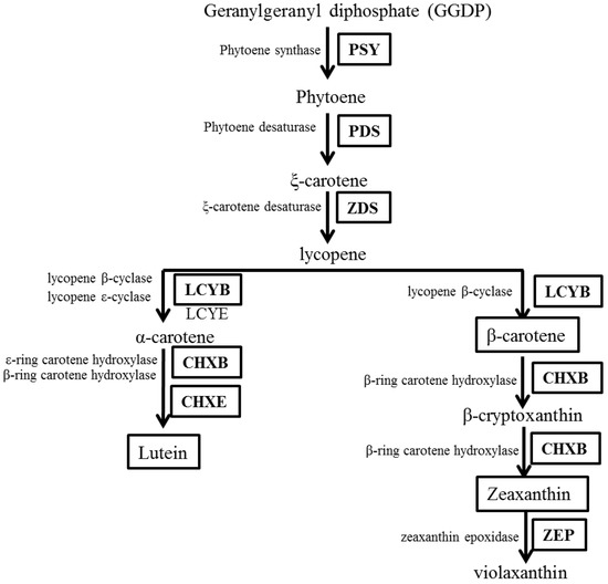 Schematic representation of carotenoid biosynthesis in plants. Carotenoids and their biosynthetic enzymes were analyzed in this study and the analyzed contents were indicated with black boxes. The scheme was generated based on the published literature.