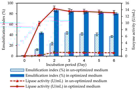 | Variable | Lipase Activity (U/mL) | Emulsification Index (%) | ||||||||||