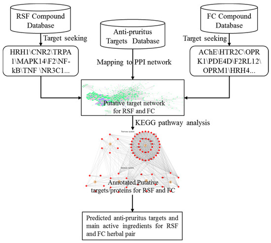 To investigate the synergic mechanism of RSF and FC for anti-pruritus, we collected the active ingredient data and associated target information for RSF and FC from publications. A herb-scaffold-target network was constructed based on the data. Since the predicted and literature-reported anti-pruritus targets are not completely consistent, we selected the intersections of the two target sets as putative anti-pruritus targets. With a protein–protein interaction network, we identified major hub nodes as significantly associated with anti-pruritus targets. This study proposes a protocol to identify the synergic mechanism of RSF and FC. The protocol (Figure 1) aims to investigate the potential synergistic mechanism of RSF and FC compounds.