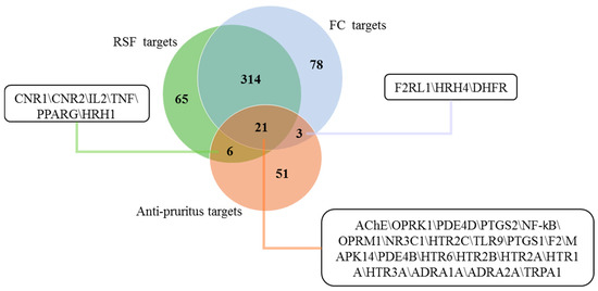Putative anti-pruritus targets of RSF and FC. Venn diagram for putative targets of RSF and FC and known anti-pruritus targets. The list of targets in the intersection sets.