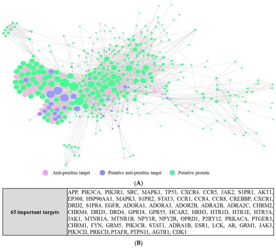 Protein–protein interaction (PPI) network of anti-pruritus targets and proteins that directly or indirectly interact with the targets. (A) The PPI network of anti-pruritus protein targets (The size of the circle represents the degree of a node); (B) A list of 65 important proteins which interact with the anti-pruritus targets.
