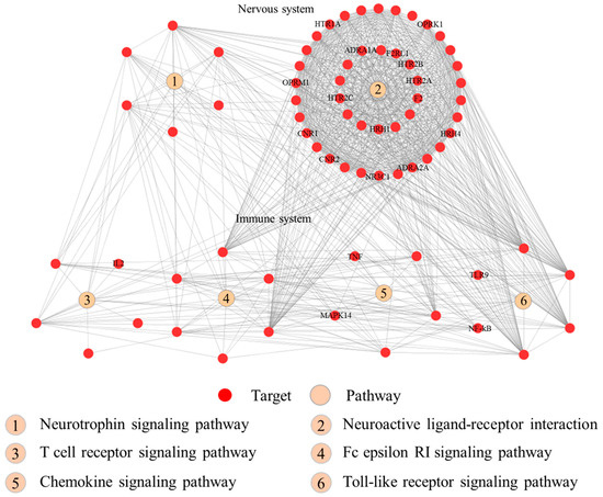 The pathway enrichment analysis indicated that the 95 putative targets of RSF and FC were enriched in 46 Kyoto Encyclopedia of Genes and Genomes (KEGG) pathways (FDR corrected p value < 0.05). The top 20 pathways associated with the herbs are listed in the Table 2. Those pathways are divided into the following four groups: organismal system, environmental information processing, human disease, and cellular process. The four immune system pathways (toll-like receptor (TLR) signaling pathway, chemokine signaling pathway, T cell receptor signaling pathway, and Fc epsilon RI signaling pathway) and two nerve-related pathways (neurotrophin signaling pathway and neuroactive ligand-receptor interaction) are depicted in Figure 5.
