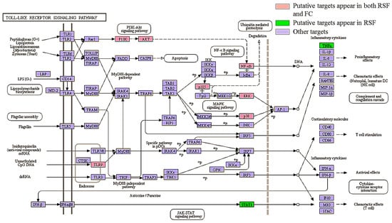 The toll-like receptor signaling pathway involves pro-inflammatory cytokine production via activation of NF-κB and MAPK [44]. TLRs play an important role in the development and severity of pruritus by increasing the excitability of primary sensory neurons [45]. The RSF and FC putative targets were mapped to the TLR signaling pathway as shown in Figure 6. Seven putative targets are associated with both RSF and FC (highlighted in red). Two putative targets are associated with RSF (highlighted in green). These proteins regulate inflammation-related gene expression in the TLR signaling pathway.