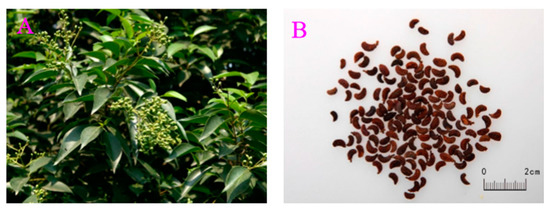 Fructus Ligustri Lucidi (FLL), known as Nvzhenzi in Chinese, is the dried mature fruit of Ligustrum lucidum Ait. (Oleaceae.) (Figure 1), and has been clinically used to treat osteoporotic bone pain and rheumatic bone for more than 1000 years [8,9,10]. It is mainly produced in Hu’nan, Sichuan, Jiangsu and Zhejiang provinces in China, and is harvested in winter by plucking the ripe fruits. FLL was first recorded in Shen Nong’s Classic Materia Medica (written during the period from 100 BCE to 200 CE), and labeled as a “top-tier” medicine (the ancient term “top-tier” was given to herbs without observable toxicity).