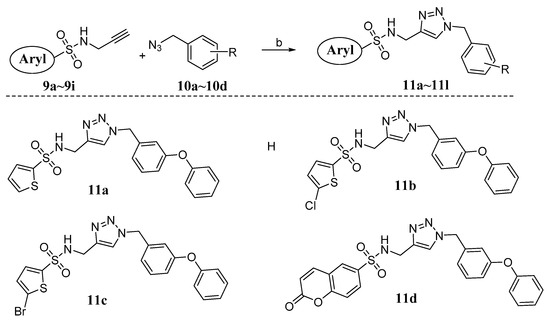 The applications of click chemistry are increasingly found in all aspects of drug discovery, ranging from lead discovery through combinatorial chemistry and target-templated in situ chemistry, to proteomics and DNA research, using bioconjugation reactions [17,18,19,20]. The sulfonamide-1,2,3-triazole hybrids 11a~l were synthesized through a click reaction between alkyne intermediates 9a~i and derivatives 10a~d using copper sulfate and sodium ascorbate in THF/H20 (Scheme 2).