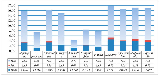 The DPPH method (2,2-diphenyl-1-picryl-hydrazyl) is one of the most common methods of in vitro determination of antioxidant capacity in plant matrices. The results of the antioxidant capacity of the alcoholic extract’s study are shown in Table 1, and they vary between 58.60 ± 1.32 (Mentha pulegium)—81.65 ± 1.82 (A. absinthium) mmol Trolox/g sample and the percentage inhibition was 1.08% ± 0.03 (Populus nigra)—1.82% ± 0.05 (Althaea officinalis, Origanum vulgare).