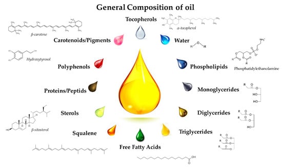 In addition to triglycerides, the presence of minor components (less than 5%) in vegetable oils (Figure 2) cannot be ignored due to their interesting biological properties and nutritional values for pharmaceutical and nutraceutical industries, particularly in virgin oils [,]. They can be divided into two types: glycerolipids such as mono- and diglycerides, phospholipids, and non-glycerolipids including sterols, tocopherols/tocotrienols, free fatty acids, vitamins, pigments, proteins, phenolic compounds, water, etc. [,]. Although some undesirable minor components must be removed by most consumers and food manufacturers during the refining processes, there is no completely efficient and selective process, which will give rise to consequent colloidal structures formed by residual minor components in oils [].