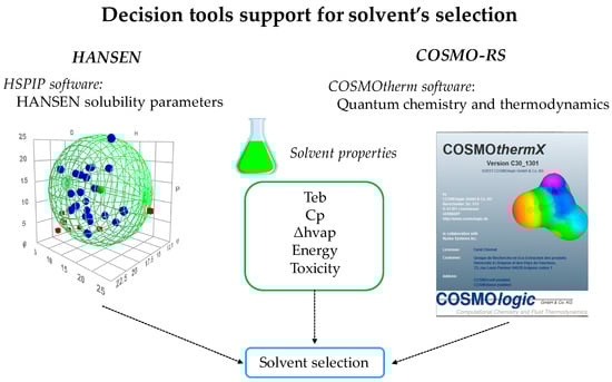 Replacing one solvent by another does not necessarily mean eliminating all the hazards and issues related to the implementation of a process. Indeed, the modification of a process is generally associated with new risks. Precautions should therefore be taken into account in the selection of an alternative solvent as for physicochemical, environmental or sanitary criteria, the eco-compatibility of the process and the price of the solvent, but also techno-economic criteria related to the properties of the solvent like dissolving power and energy consumption []. The dissolving power is a key criterion that can be evaluated using various methods such as the Kauri-butanol index, Kamlet-Taft scale, or Hildebrand and Hansen solubility parameters (HSP), but also thanks to a much more powerful tool, COnductor like Screening MOdel for Real Solvents (COSMO-RS), that can be used as a real decision tool for the choice of alternative solvents (Figure 3). On the other hand, pharmaceutical companies such as GSK [], Sanofi [], AstraZeneca [,] and Pfizer [] developed their own solvent selection guides that provide technical data and clear instructions for the development of more sustainable processes. This allows the involvement and commitment of industries in the investigation on greener alternative solvents and proves their concern for the integration of sustainable development approaches.