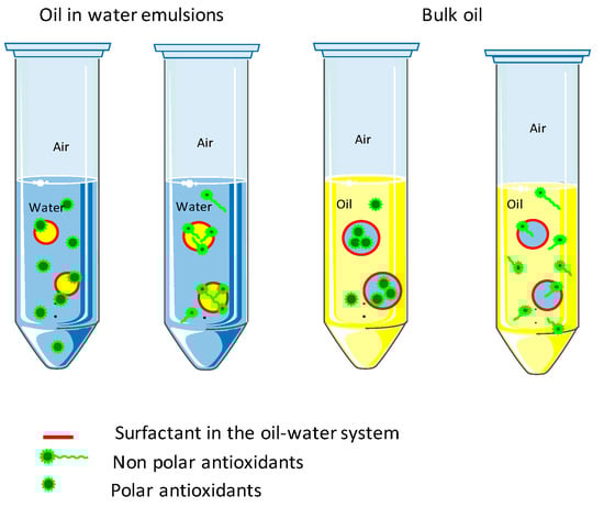 Paradoxes and inconsistencies are constantly emerging. Supramolecular chemistry as a new paradigm may shed light on lipid oxidation and antioxidant effectiveness now by reconsidering molecular shape, supramolecular interactions and the distribution of polar and nonpolar regions []. In vegetable oils, water inside or from atmosphere and other polar compounds are located in the core of reverse micelles. A depletion layer almost without surfactants exists next to the core and the outermost monolayer was comprised of surfactants, which solubility could be increased with the help of co-surfactants (e.g., short or medium chain alcohols, glycerol, sorbitol, etc.). These self-assembled micelles are considered as thermodynamically stable nano-reactors, which have different sizes and allow the dissolution of a desirable amount of polar and non-polar compounds []. Hydrophilic lipophilic balance (HLB) is empirically used to describe the antioxidant solubility in lipid systems. Endogenous or exogenous surfactants with low or intermediate HLB values, for instance, phospholipids, free fatty acids, mono- and diacylglycerides, are more favoured to form and to stabilize reversed micelles []. Traces of these minor compounds in virgin or refined vegetable oils play a vital role in micellization and further lipid preservation. Nonetheless, there are still other influencing factors (e.g., pH, log P, double bond position in unsaturated fatty acids, acyl chain length, ionicity and packing parameter of surfactants, etc.) for antioxidant effects and micelle stabilization in lipid systems, among which water activity is of paramount importance.