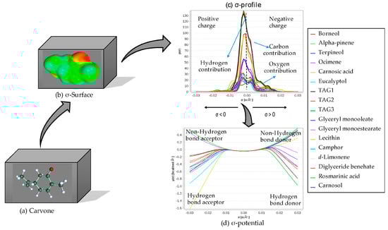 COSMO-RS to select ideal solvent for dissolving a suitable compound. (a) Carvone (solute molecule); (b) σ-surface; (c) energies of local surface interactions between σ-profiles of carvone and solvents; (d) σ-potentials of carvone and solvents.