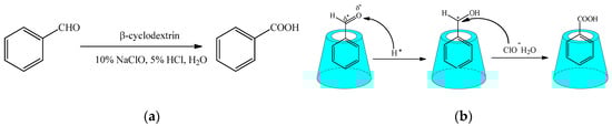 In general, the aldehyde was directly oxidized to the carboxylic acid in the heterogeneous system. However, Shi et al. [24] studied the oxidation reaction with β-cyclodextrin in the homogeneous system. Benzaldehyde could be accommodated in the β-cyclodextrin cavity to form a complex, which was dissolved in the aqueous phase. Using the mild oxidizing agents (NaClO/HCl), benzaldehyde could be oxidized to benzoic acid, and the optimum reaction conditions were explored (Scheme 4a). Under the optimized condition, the yield was up to 98%. In this reaction, the reactants were inexpensive and β-cyclodextrin could be recycled. In addition, the corresponding mechanism was that the oxidizing agents oxidized benzaldehyde to carboxylic acid when the acid provided protons (Scheme 4b).