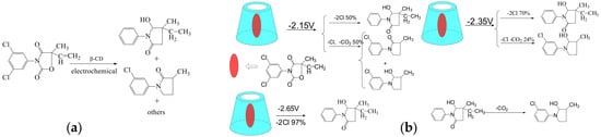 Under non-aqueous conditions, Pospisil et al. [29] studied the reduction reaction of 3-(3,5-dichlorophenyl)-5-methyl-5-vinyl-1,3-oxazolidine-2,4-dione using catalyzed by β-CD using the electrochemical method (Scheme 6a). The mechanism of the reduction of vinclozoline through the inclusion complex with β-CD was proposed (Scheme 6b).