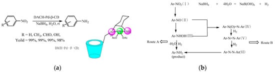 (a) The reduction reaction of nitroarene catalyzed by DACH-Pd-β-CD; (b) the proposed mechanism pathways of nitroarene reduction.