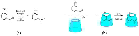 (a) The photoreduction of 3-nitroacetophenone catalyzed by β-CD-TiO2; (b) the mechanism of the photoreduction of 3-nitroacetophenone catalyzed by β-CD-TiO2.