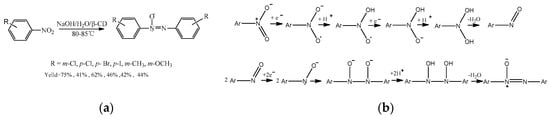 Lu et al. [32] studied the reduction reaction of nitrobenzene in the presence of sodium hydroxide and β-cyclodextrin (Scheme 9a). β-Cyclodextrin could form the inclusion complex with nitrobenzene. In the aqueous solution, the mechanism of the reduction of nitrobenzene through the one-electron transfer process was proposed (Scheme 9b).