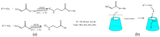 In the aspect of the Aza-Michael addition reaction, Surendra et al. [36] studied the addition reaction of amines with alkenes in the presence of β-cyclodextrin (Scheme 11a). When the contents of β-cyclodextrin increased, the yields were improved. More interestingly, β-cyclodextrin (as the catalyst) could be recycled. The mechanism of the addition of amines with alkenes mediated by β-cyclodextrin was proposed (Scheme 11b).