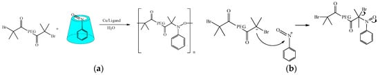 Condensation polymerization was a simple method for the synthesis of the sequence chain. Tao et al. [38] synthesized a hydrophilic periodic polymer using the nitroso benzene/cyclodextrin complex (Scheme 13a). Firstly, the water-soluble inclusion complexes of CD/NB were formed and then polymerized with poly (ethylene glycol) bis (α-bromoisobutyrate) to produce macromolecular polymers in good yield. The mechanism of this reaction was proposed (Scheme 13b). The process provided a simple method to synthesize the sequence chain and was beneficial to the application in industry.