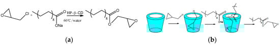 Regarding the Diels–Alder reaction, Alupei et al. [37] reported the addition reaction of cyclopentadiene with unsaturated polyester in the presence of methylated-β-cyclodextrin and synthesized a new type of polypseudorotaxane (Scheme 12a). The results indicated that the complex of cyclopentadiene with cyclodextrin was formed in water under room temperature, which greatly enhanced the stability and solubility of the monomer in water. Thus, the Diels–Alder reaction could be successfully carried out in an environmentally friendly manner by using the resulting complex of cyclopentadiene and methylated-β-cyclodextrin. The mechanism of the addition reaction of cyclopentadiene with unsaturated polyester through the inclusion complex with methylated-β-cyclodextrin was proposed (Scheme 12b).