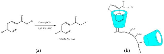 Kiasat et al. [43] developed the substitution reaction of phenacyl derivatives in water using β-cyclodextrin immobilized on Dowex resin as an efficient solid-liquid phase transfer catalyst (Scheme 17a). The nucleophilic substitution reactions were carried out under a mild reaction condition and given the products in good yields (80–95%). Also, the plausible reaction mechanism of alkyl halides catalyzed by Dower-β-CD was proposed (Scheme 17b). Furthermore, the catalyst could be recycled and reused by convenient separation with little loss of activity.