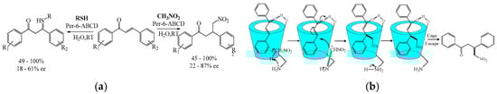 Cyclodextrin was also used in the asymmetric addition reaction. Pitchumani et al. [56] studied the asymmetric Michael addition of nitromethane and aliphatic thiols in aqueous media using per-6-amino-β-cyclodextrin (per-6-ABCD) as a chiral base catalyst (Scheme 24a). A better enantiomeric excess (60.6%) was observed in water at room temperature with good yield. The catalyst could be recovered and reused with little loss in its activity. The mechanism of the asymmetric addition of nitromethane and aliphatic thiols through the inclusion complex with per-6-ABCD was proposed (Scheme 24b). Using the same catalyst (per-6-ABCD), Pitchumani et al. [57] reported the asymmetric synthesis of 2-aryl-2,3-dihydro-4-quinolones with high yield (up to 99%) and enantiomeric excess (up to 99%).