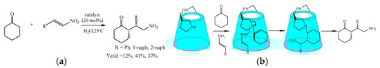 Similarly, the asymmetric Michael addition of cyclohexanone and 2-nitro-β-nitrostyrene was reported by Zhu et al. [58]. Using (S)-2-aminomethylpyrrolidine-modified β-CD as the supramolecular catalyst (Scheme 25a), a good enantiomeric excess of 71% was observed in an aqueous buffer solution. The mechanism of the asymmetric Michael addition of cyclohexanone and 2-nitro-β-nitrostyrene was proposed (Scheme 25b).