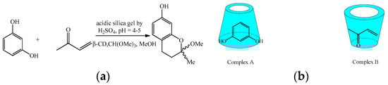 In the application of the asymmetric addition reaction based on cyclodextrins, Ni et al. [62] developed the asymmetric synthesis of (+)-2-methoxy-2-methylchroman-7-ol in solid-state using β-cyclodextrin as the chiral catalyst (Scheme 27). The chiral product was obtained from β-CD/1, 3-dihydroxylbenzene, and methyl vinyl ketone/β-CD in 82.8% yield and 78.4% ee.
