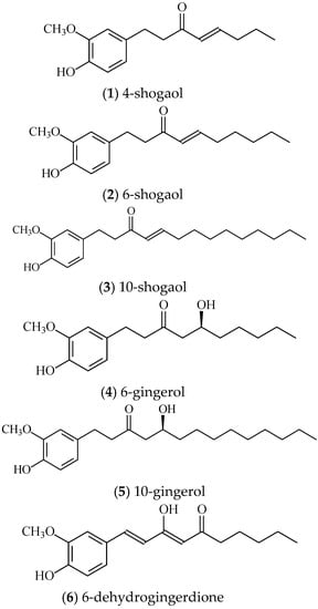 The chemical structure of 4-shogaol (1), 6-shogaol (2), 10-shogaol (3), 6-gingerol (4), 10-gingerol (5), and 6-dehydrogingerdione (6).