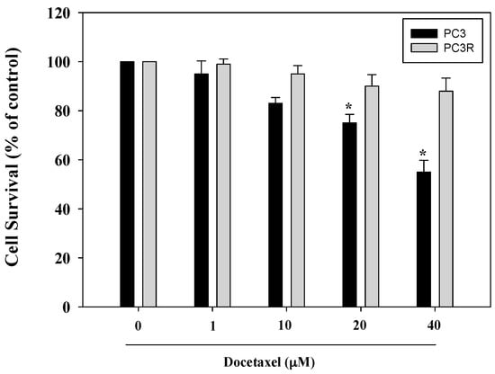 Effects of docetaxel on PC3 and PC3R cell viability at 24 h time point. Data were summarized from three independent experiments. * p < 0.05 vs. docetaxel (0 μM) group.
