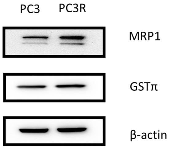 The protein expression of multidrug resistance associated protein 1 (MRP1) and glutathione-S-transferase (GSTπ) in docetaxel-resistant (PC3R) and PC3 human prostate cancer cells. Results are representative of three experiments.