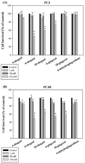 Effects of 4-shogaol (1), 6-shogaol (2), 10-shogaol (3), 6-gingerol (4), 10-gingerol (5), and 6-dehydrogingerdione (6) on PC3 (A) and PC3R (B) cell viability. These compounds decreased cell viability at 24 h time point. Data were summarized from three independent experiments. * p < 0.05 vs. control group.