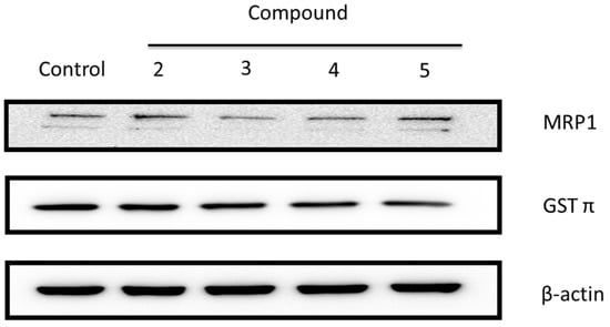 We found that GSTπ and MRP1 protein expression in PC3R cell was higher than in PC3 cells. We further examined the protein level of GSTπ and MRP1 at 100 μM of 6-shogaol (2), 10-shogaol (3), 6-gingerol (4), and 10-gingerol (5) treatment at 24 h in PC3R cells. As shown in Figure 5, the protein expression was decreased after treatment. These results shown that 6-shogaol (2), 10-shogaol (3), 6-gingerol (4), and 10-gingerol (5) can affect GSTπ and MRP-1 protein expression in docetaxel resistant PC3 cell line (PC3R). The results were shown in Figure 5.