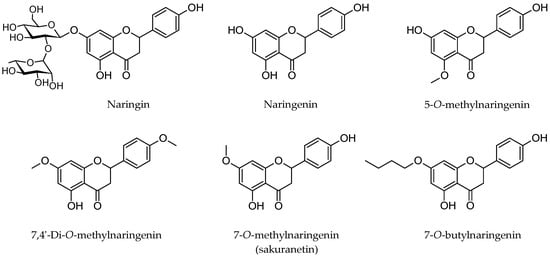 In the present paper, the most interesting substrate was naringenin (4′,5,7-trihydroxyflavanone), which possesses a wide spectrum of biological activities including antibacterial, antifungal, antioxidant, and anticancer activities [5,6]. Currently, there are known O-alkyl derivatives of naringenin containing methyl and ethyl groups attached to ring A and B. Naringenin and ether derivatives of naringenin were observed in plant extracts of the Boraginaceae family. In particular, 5-O-methylnaringenin, 7,4′-di-O-methylnaringenin and sakuranetin (7-O-methylnaringenin) (Figure 1) were isolated from Cordia globosa, Echiochilon fruticosum, Heliotropium indicum, Heliotropium stenophyllum and Corymbia torelliana [7,8]. Sakuranetin, which is present in rice plants, is a natural phytoalexin and provides effective protection against damage caused by microorganisms [9]. Moreover, it possesses anti-inflammatory activity and prevents vascular and parenchymal changes [10]. Derivatives with a benzyl group at the C-7 position regulate apoptosis in human colorectal carcinoma (RKO) cells as a result of the intracellular production of reactive oxygen species (ROS) [11]. Furthermore, 7-O-butylnaringenin exhibits antibacterial activity against methicillin-resistant Staphylococcus aureus (MRSA), which is one of the most important pathogens in hospitals [12].