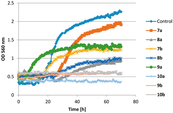 The strongest inhibitory effect was observed for compounds 8b and 9b in E. coli ATCC10536 culture. Moreover, naringenin oxime completely prevented the growth of this strain of bacteria and A. niger DSM1957. Compounds 2b and 5b also showed a strong inhibitory effect against this filamentous fungus. Derivative 9b also hindered A. niger DSM1957 growth and, additionally, prolonged the adaptive phase. Total inhibition of F. linii KB-F1 growth was achieved by the action of oximes 9b and 10b (Figure 3).