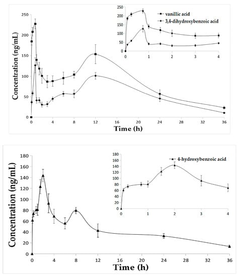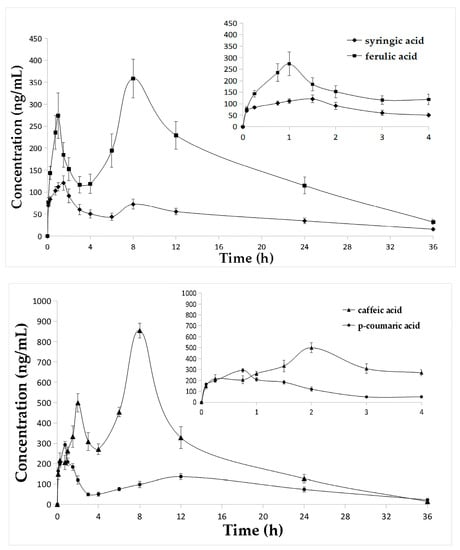 In this study, the validated UHPLC-ESI-MS/MS method was successfully applied in pharmacokinetic studies of the seven phenolic acids in 12 rats after oral administration of E. purpurea extract. Mean concentration-time profiles of the seven analytes in rat plasma are presented in Figure 3, and mean pharmacokinetic parameters are summarized in Table 4. The results showed that vanillic acid, p-coumaric acid and 3,4-dihydroxybenzoic acid were rapidly absorbed, the Tmax for these compounds were 0.75 h, 0.75 h and 0.77 h, respectively. Meanwhile, the Tmax of syringic acid and 4-hydroxybenzoic acid were 1.54 h and 1.96 h. The Tmax of ferulic acid and caffeic acid were both 8 h, longer than the above compounds., and this was possibly due to the amount of the same parent components in the extract and hydrolysis of these two compounds at 8 h. While, T1/2 ranged from 5.31 h to 14.91 h, the Cmax values varied in these analytes, 122.50 ± 16.43 ng/mL for syringic acid, 358.68 ± 43.84 ng/mL for ferulic acid, 854.61 ± 35.88 ng/mL for caffeic acid, 227.56 ± 11.94 ng/mL for vanillic acid, 292.51 ± 16.38 ng/mL for p-coumaric acid, 126.64 ± 18.07 ng/mL for 3,4-dihydroxybenzoic acid and 144.71 ± 11.62 ng/mL for 4-hydroxybenzoic acid. It was found that caffeic acid showed a different absorption from other compounds because of its high concentration in rat plasma. Moreover, AUC0→t for these compounds ranged from 1643.96 ± 121.54 ng h/mL to 9217.13 ± 452.54 ng h/mL, and AUC0→∞ ranged from 1946.57 ± 164.14 ng h/mL to 9326.39 ± 441.68 ng h/mL. This may suggest that the absorption of caffeic acid was the highest among these analytes while syringic acid and 4-hydroxybenzoic acid were lowest. The results could help to investigate the action mechanism of these seven phenolic acids further and provided useful pharmacokinetic information about E. purpurea.