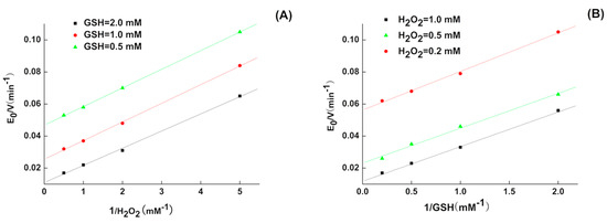 where v0 is the initial reaction rate, [E]0 is the initial enzyme mimic concentration, kmax is a pseudo-first order rate constant, and KH2O2 and KGSH are the Michaelis-Menten constants (Km) for H2O2 and GSH, respectively. From Table 1, we could see that 5P had the ability to combine with the substrate GSH (Km,GSH = 9.4 mM), which may explain why that 5P had good catalytic capacity. The second order-rate constants (kmax/Km,H2O2) was 8.54 × 104 M−1 min−1 and there was no significant difference with CysSeSeCys (kmax/Km,H2O2 = 5.3 × 104 M−1 min−1) reported by B.G. Singh [13]; however, the kmax/Km,GSH (3.5 × 104 M−1 min−1) was higher than CysSeSeCys (kmax/Km,GSH = 2.3 × 102 M−1 min−1), suggesting that 5P may have better catalytic efficiency for GSH. Double reciprocal plots of the initial velocity versus the concentration of substrates gave a family of parallel lines (Figure 1), indicating that the reaction mechanism was a ping-pong mechanism analogous to those of the natural GPxs [14]. The affinity with both substrates was higher than that of the other substrates alone.