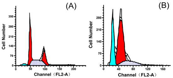 DNA cell cycle analysis in control H22 cells (A) and inhibitory effects of 5P (20 μM, 48 h) on H22 apoptosis (B). (the cyan part represents the Go/G1 phase, the red part represents the G2/M phase and the dark part represents the S phase).