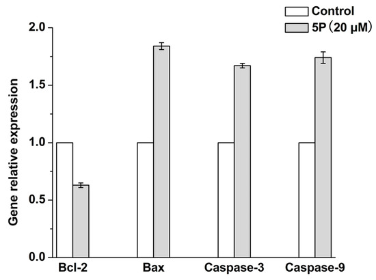 In order to observe changes in the transcription of apoptotic genes, we used reverse transcription polymerase chain reaction (RT-PCR). The results showed that, compared with the negative control group, 20 μM 5P reduced the expression of anti-apoptotic Bcl-2 and upregulated pro-apoptotic Bax in H22 cells.