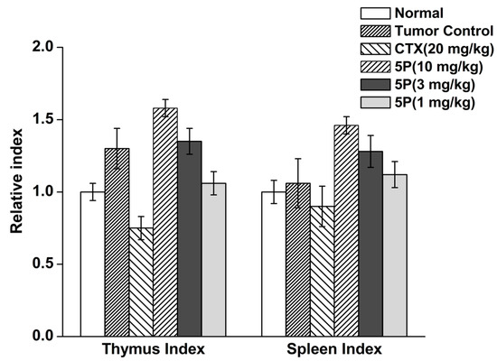 After continuous dosing for 10 days, CTX decreased the thymus and spleen indexes in H22 tumor-bearing mice. At a dose of 20 mg/kg, 5P significantly increased the thymus and spleen indexes in H22 tumor-bearing mice. Other doses of 5P did not affect the indexes compared with the tumor control group (Figure 4).