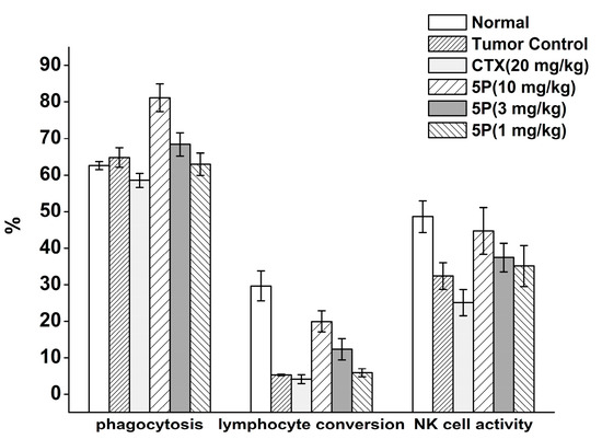 Compared with the normal group, the CTX group showed significant decreases in phagocytosis, lymphocyte conversion, and natural killer (NK) cell activity. In contrast, phagocytosis, lymphocyte conversion, and NK cell activity were increased in the 5P group, with increased phagocytosis as the dose increased (Figure 5).
