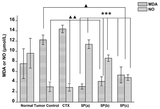 Effects of 5P on malondialdehyde (MDA) and nitric oxide (NO) contents in blood plasma of H22 tumor-bearing mice. 5P(a): 10 mg/kg, 5P(b): 3 mg/kg, 5P(c): 1 mg/kg. *** p < 0.001 versus the tumor control group; ▲▲ p < 0.001 versus the normal group; ▲ p < 0.05 versus the normal group.