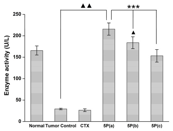 Notably, we found that different doses of 5P significantly increase tumor GPx activity in mouse plasma compared with the tumor control group (p < 0.001; Figure 7).