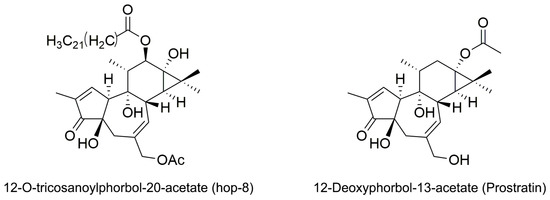 Structure of 12-O-tricosanoylphorbol-20-acetate (hop-8) and 12-Deoxyphorbol-13-acetate (prostratin).